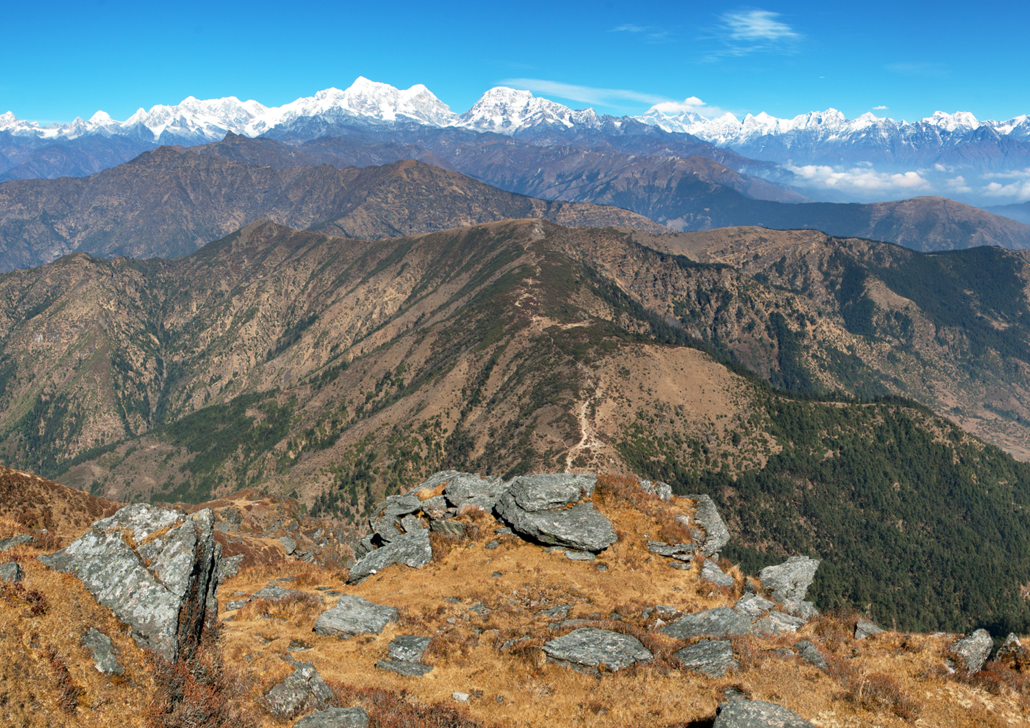 La traversée de villages authentiques de moyenne montagne, tels que Jiri, Shivalaya, Gora ou Merangding, au cœur de paysages himalayens préservés